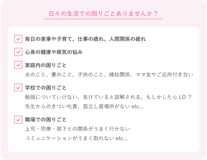 毎日の家事や子育て、仕事の疲れ、学校、職場、家庭内での困りごと、人間関係の悩みなど、なかなか誰にも相談できないこと、誰にも言えない本音を打ち明けて頂き、気持ちが楽になったなあと感じて頂けるよう、つとめてまいります。
