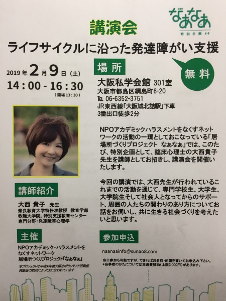 来月2月9日講演会「ライフサイクルに沿った発達障がい支援」を開催させて頂きます。